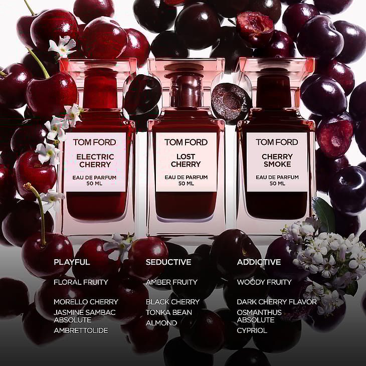 Ylenpalttinen. Houkutteleva. Kyltymätön. Tom Ford Lost Cherry on hedelmällinen matka sinne, mikä kerran oli kiellettyä: tuoksu täynnä härnääviä vastakohtia – leikkisä karkkimainen hehku ulkopuolella ja ylenpalttista hedelmälihaa sisäpuolella. Viattomuus ja nautinto kohtaavat, kun tuoksu avautuu eksoottisen kirsikan klassisella täydellisyydellä – tumman kirsikan kypsä hedelmäliha, joka valuu kirsikkalikööriä ja yhdistyy karvasmantelin kiusoittelevaan vivahteeseen, ja sen jälkeen lähes räjähtää kirsikan makean kirpeiksi aalloiksi. Turkkilaisen ruusun ja arabianjasmiinin kiehtovat sävyt hemmottelevat mieltä ja aisteja. Eksoottisten ainesosien ja jalopuiden arvaamaton yhdistelmä viimeistelee tuoksun inspiroivasti ja kyltymättömästi.
