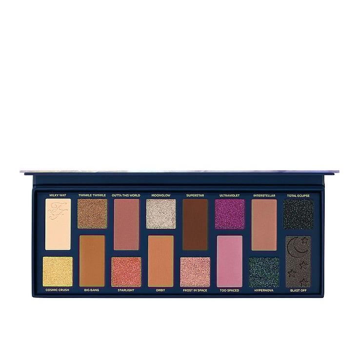 Upea luomiväripaletti sisältää 16 monipuolista, runsaspigmenttistä ja ultramodernia sävyä, jotka tuovat mieleen ulkoavaruuden.