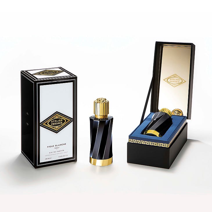 Vuonna 1989 perustettu Atelier Versace keskittyy erityisesti muotoilun, materiaalien ja teknologian innovaatioon ja tutkimukseen. Väsymätön ensiluokkaisten materiaalien valikointi ja ainutlaatuinen käsityö ovat mahdollistaneet kokoelman eksklusiivisia Atelier Versace -nimeä kantavia tuoksuja. Ylellinen kokoelma koostuu 12 tuoksusta, joihin kuuluu niin raikkaita ja kukkaisia kuin puuvivahteisia, mausteisia kuin itämaisiakin tuoksuja. Tuoksut ja pakkaukset on valmistettu huolellisesti käsin. Kevyemmät ja raikkaammat tuoksut on pakattu tyylikkäisiin läpikuultaviin lasipulloihin, kun taas intensiivisemmät tuoksut on pakattu elegantteihin mustiin pulloihin. Jokainen veistoksellinen pullo tulee meanderikuvioidussa, käsinmaalatussa laatikossa, jonka sisäpuolella on Atelier-logolla koristettu peili. Figue Blanche tuo mieleen kesän Välimerellä. Se sisältää raikkaan viikunan nuotteja yhdistettynä italialaisen mandariinin hedelmälihaan ja eteerisiin öljyihin. Lämpimät tuoksunuotit sekoittuvat bergamotin ja nerolin mehukkaisiin vivahteisiin. Lisäksi tuoksu sisältää jasmiinia ja ruusunlehteä. Figue Blanche -tuoksun on luonut parfymööri Marypierre Julien, joka pyrkii tuomaan esiin jotain odottamatonta kaikkein tunnetuimmista tuoksunuoteista. Atelier Versace – esteettisestä tutkimuksesta ja visionäärisestä muotoilusta satojen tuntien huolelliseen käsityöhön.