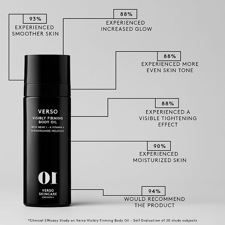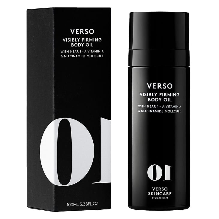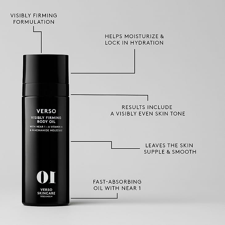 Verso N°10 Visibly Firming Body Oil With NEAR 1 on silkinpehmeä ja nopeasti imeytyvä vartaloöljy, joka tekee ihosta pehmeän, sileän ja heleän sekä tasoittaa ihon sävyä. Öljyn edistyksellinen koostumus sisältää NEAR 1 -tähtiainesosan, Verson patentoidun teknologian, joka yhdistää A-vitamiinin ja niasiiniamidin. Silkinpehmeä koostumus antaa ylellisen, raikkaan ja hoitavan tunteen – ilman tahmaista tunnetta eikä tuki ihohuokosia. Kosteuttaa ihoa pitkäkestoisesti. Lisäksi vartaloöljy tekee pigmenttimuutoksista vähemmän näkyviä sekä ihon rakenteesta tasaisemman, sileämmän, kimmoisamman ja kiinteämmän ja antaa hehkua. Täydellinen vartaloöljy, jos haluat vastustaa ja vähentää ihon ja ihon sävyn epätasaisuuksia, kuivuutta, kiinteyden puutetta ja sameaa ulkonäköä.