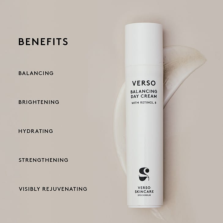 Verso Balancing Day Cream on kevyt päivävoide, joka kosteuttaa ja tasapainottaa ihoa sekä vahvistaa ihon luonnollista puolustuskykyä ulkoisia rasitteita vastaan. Koostumus sisältää Retinol 8 -ainesosan, niasiiniamidia ja kurkumaa – yhdistelmä, joka on erityisesti kehitetty rauhoittamaan ja raikastamaan ihoa sekä tasoittamaan ihon sävyä. Lisäksi Verso Balancing Day Cream auttaa silottamaan ihon rakennetta, avaamaan tukkeutuneita ihohuokosia ja vähentämään liiallista rasvaa, joten se sopii ihanteellisesti seka- ja rasvoittuvalle iholle. Lopputuloksena on iho, joka on rauhoittunut ja sileämpi, ja sillä on luonnollista, hyvinvoivaa hehkua.