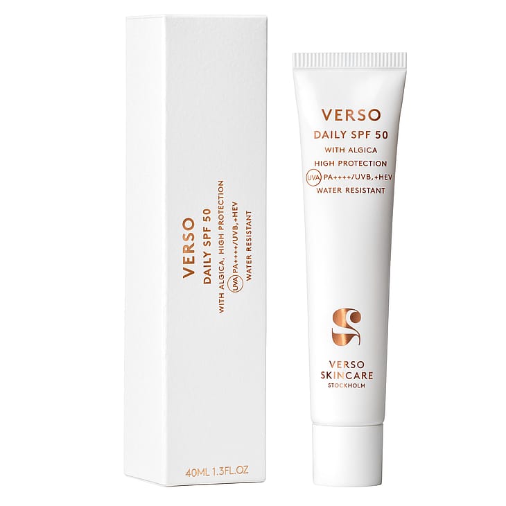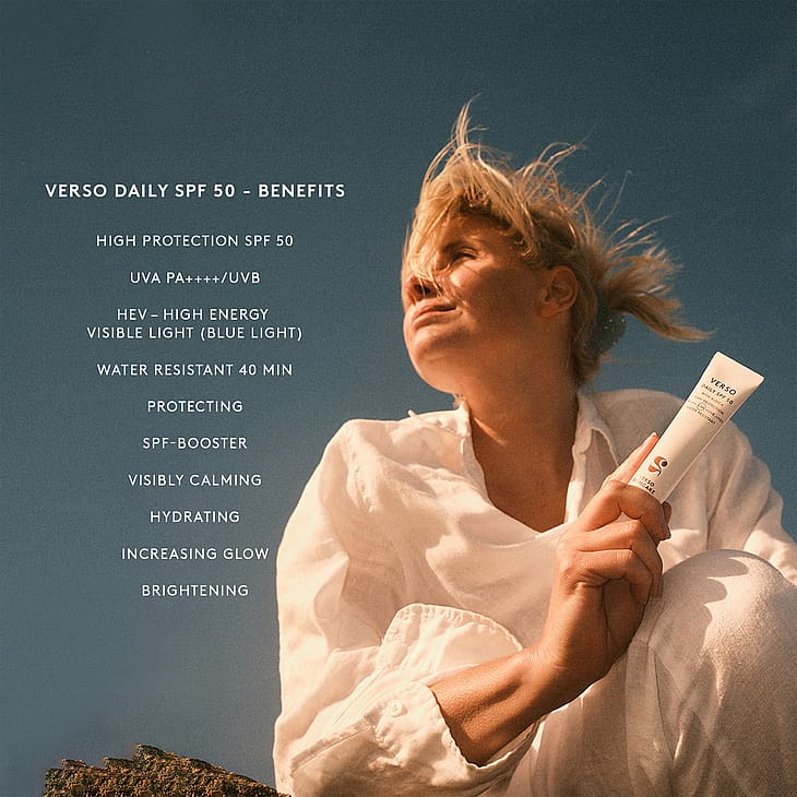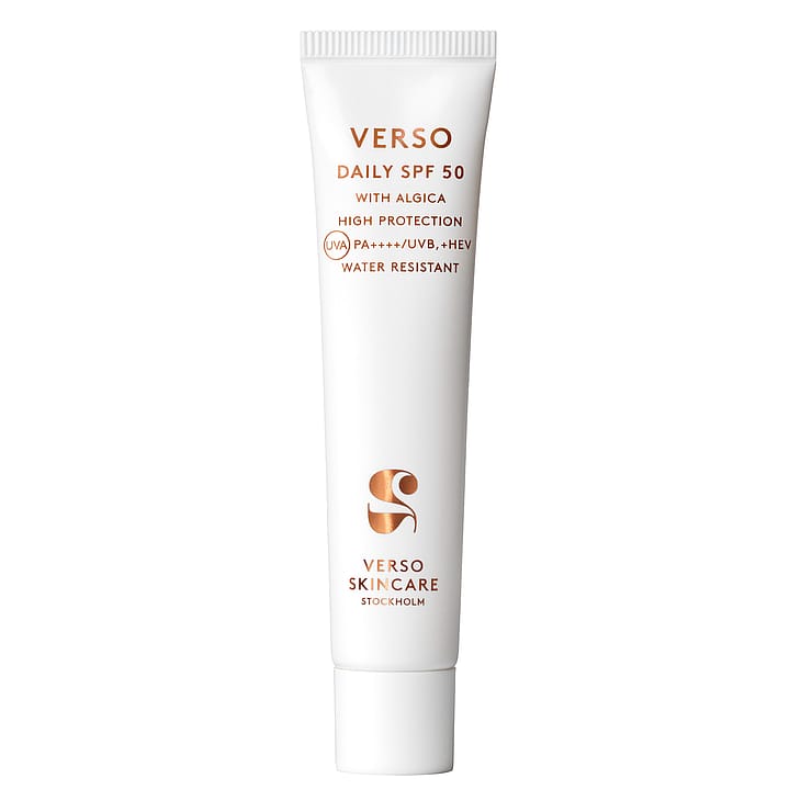 Verso Daily SPF 50 on innovatiivinen ja kosteuttava aurinkosuoja, joka suojaa ihoa ja antaa hyvinvoivaa, raikasta hehkua. Tuote sisältää ainutlaatuista ruotsalaista levää, algicaa, joka vahvistaa ja tehostaa suojakertoimen tasoa, kosteuttaa intensiivisesti ja vahvistaa ihon luonnollista suojaa ympäristörasituksia vastaan. Lisäksi koostumus sisältää fermentoitua kauraa, jolla on pre-, post- ja probioottisia ominaisuuksia. Ne rauhoittavat ihoa, vähentävät ärsytystä, kiinteyttävät ihoa ja antavat raikasta hehkua. Antioksidanttinen E-vitamiini suojaa ihoa ympäristövaikutuksilta ja auttaa vahvistamaan muita aktiiviainesosia. Kevyt koostumus ei jätä valkoista kalvoa tai tahmeaa tunnetta – lopputulos on silkinpehmeä, luonnollisen hehkuva iho, joten voide sopii täydellisesti päivittäiseen käyttöön. Koostumus antaa UVA/UVB-suojan sekä suojan HEV-valoa (sinistä valoa) vastaan. Vegaaninen, tuoksuton ja silikoniton koostumus. Koostumuksen kemialliset UV-suodattimet ovat koralleille turvallisia.
