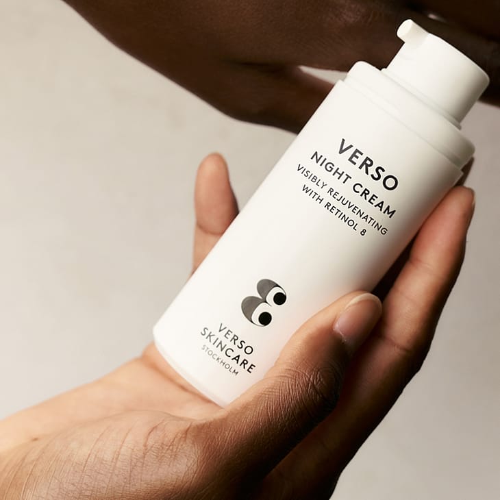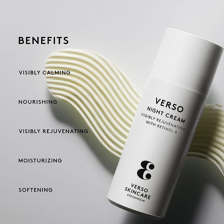 Verso Night Cream on rauhoittava ja korjaava yövoide, joka sisältää Retinol 8 -ainesosan, ainutlaatuisen A-vitamiiniyhdistelmän, joka on kahdeksan kertaa tehokkaampi kuin perinteinen retinoli. Retinol 8 tekee ihosta näkyvästi joustavamman, tasoittaa ihon sävyä ja antaa kimmoisuutta. Lisäksi se toimii antioksidanttisena suojana, vastustaa ihon ennenaikaista ikääntymistä ja auttaa antamaan hyvinvoivan ulkonäön. Koostumus sisältää myös kosteuttavaa skvalaania, pehmentävää karitevoita ja korjaavaa E-vitamiinia, jotka vahvistavat muiden ainesosien vaikutusta. Yövoide antaa iholle suojaa ympäristötekijöitä vastaan, vastustaa kosteuden menetystä ja tasapainottaa ihoa sekä antaa sille täyteläistä kimmoisuutta. Verso Night Cream sisältää lisäksi kurkumaa, tehokasta antioksidanttia, joka auttaa rauhoittamaan ihoa, vähentämään punoitusta ja tasoittamaan ihon sävyä – tuloksena nuorekkaamman näköinen, uudistuneen hehkuva iho.