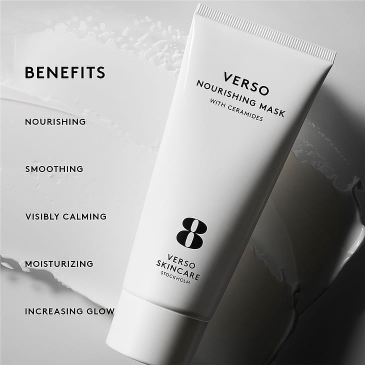 Verso Nourishing Mask on täyteläinen ja ravitseva kasvonaamio, joka auttaa kohentamaan ihon kosteustasoja ja antamaan luonnollista hehkua. Kasvonaamio on erityisesti suunniteltu kuivalle iholle ja vahvistaa ihon luonnollista suojaa. Keramidit antavat välitöntä kosteutusta, vähentävät kuivuuden merkkejä sekä kosteuttavat ja ravitsevat ihoa täydellisesti. Lopputuloksena on hehkuva, sileä, kimmoisa ja hyvinvoiva iho. Koostumuksen keramidiyhdistelmä suojaa ja vahvistaa ihoa sekä tukee ihon hyvinvointia. Hydrolisoitu hiivauute edistää hyaluronihapon tuotantoa ja auttaa ihoa säilyttämään kosteutta ja vastustamaan ulkoisia rasituksia. Isomerisoitu sakkaridi kosteuttaa tehokkaasti ja antaa sekä välittömiä että pitkäkestoisia tuloksia.