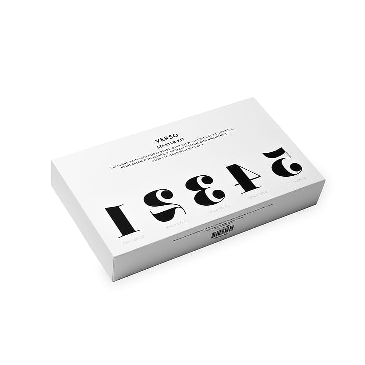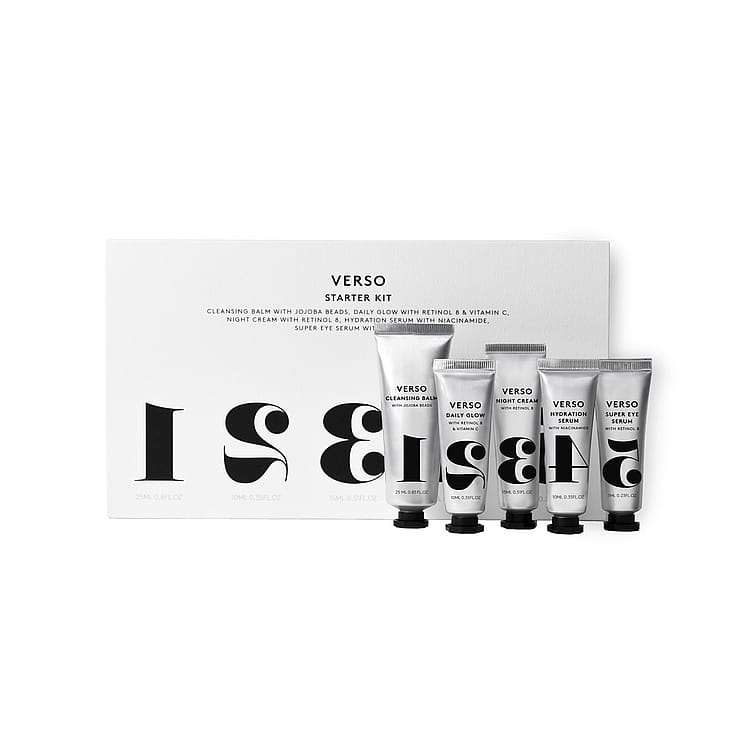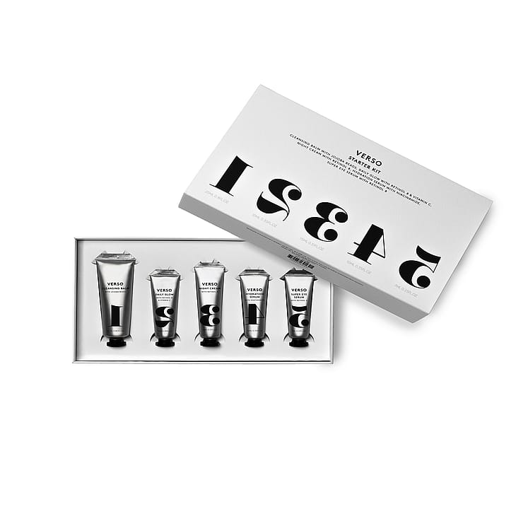 Verso Skincare Starter Kit -setti sisältää tarkoin valikoidun kokoelman ihonhoitotuotteita tehokkaaseen ihonhoitorutiiniin. Verso Cleansing Balm (25 ml) puhdistaa ihoa sekä antaa kosteuttavan ja kuorivan vaikutuksen, Verso Daily Glow (10 ml) antaa välitöntä ja pitkäkestoista hehkua ja Verso Night Cream (15 ml) pehmentää ihoa sekä vähentää ennenaikaisen ikääntymisen näkyviä merkkejä. Verso Hydration Serum (10 ml) kosteuttaa välittömästi ja pitkäkestoisesti, ja Verso Super Eye Serum (7 ml) vähentää turvotusta, tummia silmänympäryksiä ja ihonsävyn epätasaisuutta.