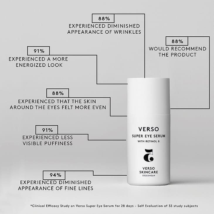 Verso Super Eye Serum on silmänympärysseerumi, joka antaa silottavan ja kiinteyttävän vaikutuksen, vastustaa ikääntymisen merkkejä ja antaa silmänympärysiholle pirteämmän ulkonäön. Ainutlaatuinen koostumus sisältää Retinol 8 -ainesosan ja peptidejä, jotka häivyttävät tummia silmänympäryksiä, turvotusta ja juonteita. Retinol 8 on stabilisoitu A-vitamiiniyhdistelmä, joka on kahdeksan kertaa perinteistä retinolia tehokkaampi (mutta paljon hellävaraisempi). Lisäksi koostumus sisältää kurkumaa, tehokasta antioksidanttia, joka suojaa ihoa ympäristörasitusten, kuten saasteiden ja auringon, negatiivisilta vaikutuksilta. Juonteet ja rypyt silottuvat ja silmänympärysihosta tulee kimmoisampi sekä levänneen ja nuorekkaamman näköinen. Ilmatiiviin pakkauksen ansiosta koostumus säilyy tuoreena, ja kätevä pumppu tekee seerumin annostelusta ja levityksestä helppoa.