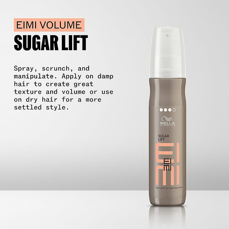Wella Professionals EIMI Sugar Lift on tuuheuttava ja rakennetta antava suihke, joka antaa voimakasta pitoa. Sisältää sokeria ja muotoilupolymeerejä, jotka antavat hiuksille nostetta ja tuntuvaa kiinteyttä. Vahvistaa kiharoita ja antaa hiuksille kaunista luonnollista kiiltoa, tuuheutta ja rakennetta. Tuotteessa on hedelmäinen tuoksu ja voimakas pito.