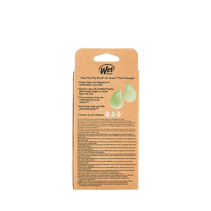 Iloisemmat hiukset ovat kätesi ulottuvilla Wet Brush Go Green® Palm Detanglerilla. Harja hemmottelee hiuksiasi ainutlaatuisella muotoilullaan, joka on suunniteltu poistamaan takut hallitusti ja mukavasti. Hiuksesi saavat ansaittua hoitoa, sillä harjan pehmeät IntelliFlex®-harjakset liukuvat takkujen läpi. Lisäksi sen kompakti koko tekee siitä täydellisen matkakäyttöön, joten voit pitää hiuksesi upeina missä tahansa oletkin. Harjan runko on valmistettu 59 % kasvipohjaisesta muovista ja ainutlaatuiset Intelliflex®-harjakset liukuvat takkujen läpi, jolloin hiuksiisi kohdistuu 45 % vähemmän vaurioita ja sinun täytyy nähdä 55 % vähemmän vaivaa!