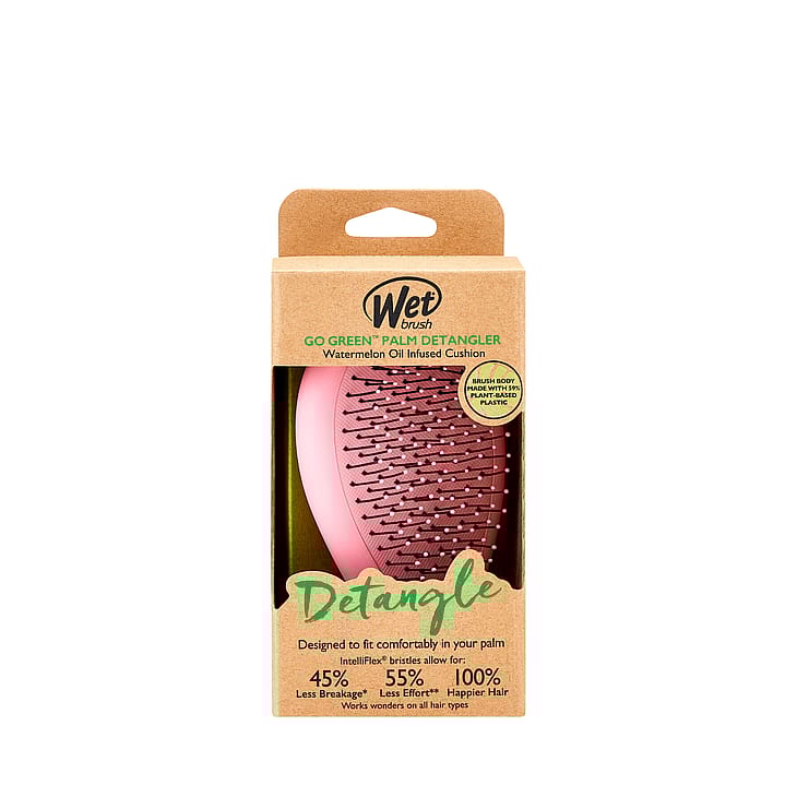 Iloisemmat hiukset ovat kätesi ulottuvilla Wet Brush Go Green® Palm Detanglerilla. Harja hemmottelee hiuksiasi ainutlaatuisella muotoilullaan, joka on suunniteltu poistamaan takut hallitusti ja mukavasti. Hiuksesi saavat ansaittua hoitoa, sillä harjan pehmeät IntelliFlex®-harjakset liukuvat takkujen läpi. Lisäksi sen kompakti koko tekee siitä täydellisen matkakäyttöön, joten voit pitää hiuksesi upeina missä tahansa oletkin. Harjan runko on valmistettu 59 % kasvipohjaisesta muovista ja ainutlaatuiset Intelliflex®-harjakset liukuvat takkujen läpi, jolloin hiuksiisi kohdistuu 45 % vähemmän vaurioita ja sinun täytyy nähdä 55 % vähemmän vaivaa!