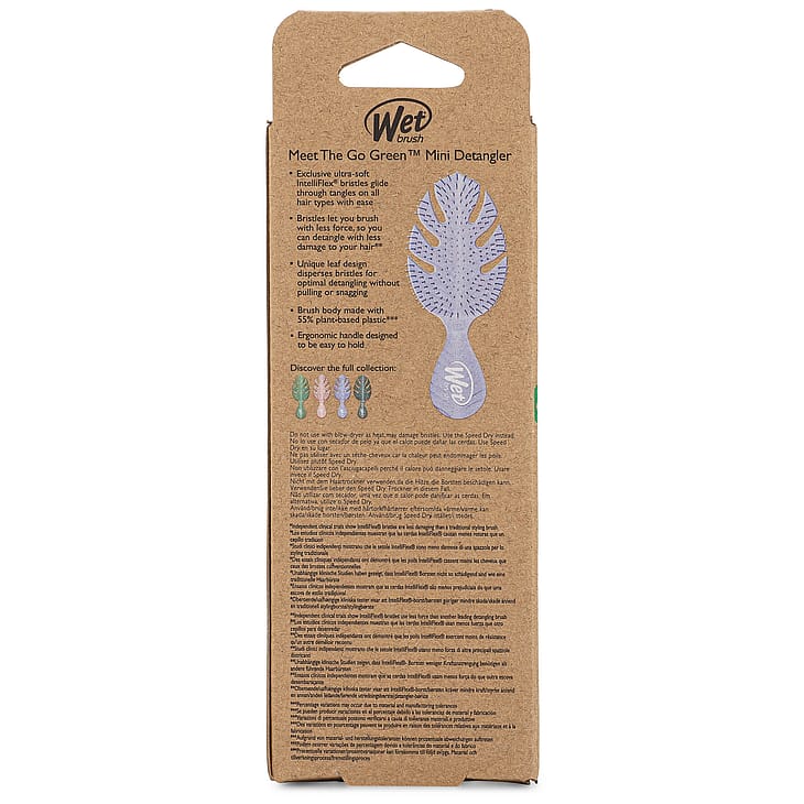 Wet Brush Go Green Mini Detangler on ympäristöystävällinen ja biohajoava minikokoinen hiusharja, joka selvittää pahimmatkin takut pois repimättä. Kahva on valmistettu biohajoavasta kasvitärkkelyksestä. Se hajoaa kaatopaikalla luonnollisesti viidessä vuodessa.