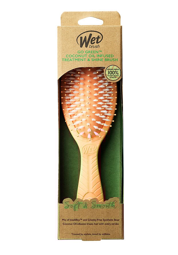 Den biologiskt nedbrytbara Wet Brush Go Green Treatment and Shine är den perfekta hårborsten för ostyrigt och trassligt hår. Borstens syntetiska IntelliFlex-borst® är idealiskt mjuka och elastiska på tovor precis rätt utan att skada håret. Borsten rör sig lätt i håret och smeker hårbotten med en masserande känsla. Som en unik egenskap innehåller kudddelen av borsten vattenmelonfröolja som vårdar håret, vilket mjukar upp och låser in fukt i håret. OBS! Hög temperatur kan skada borsten. Rekommenderas inte för användning vid föning.