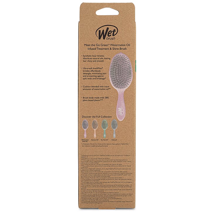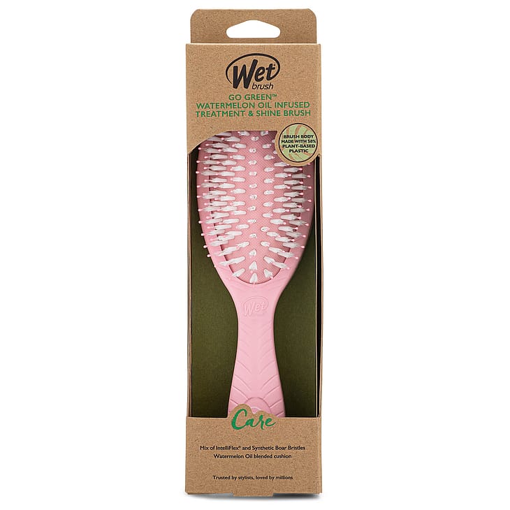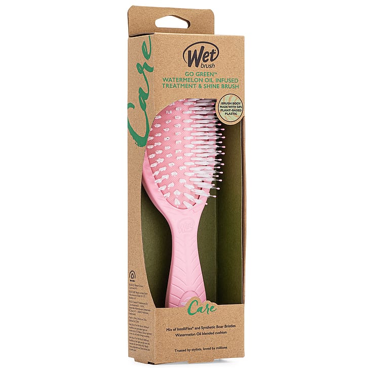 Den biologiskt nedbrytbara Wet Brush Go Green Treatment and Shine är den perfekta hårborsten för ostyrigt och trassligt hår. Borstens syntetiska IntelliFlex-borst® är idealiskt mjuka och elastiska på tovor precis rätt utan att skada håret. Borsten rör sig lätt i håret och smeker hårbotten med en masserande känsla. Som en unik egenskap innehåller kudddelen av borsten vattenmelonfröolja som vårdar håret, vilket mjukar upp och låser in fukt i håret. OBS! Hög temperatur kan skada borsten. Rekommenderas inte för användning vid föning.