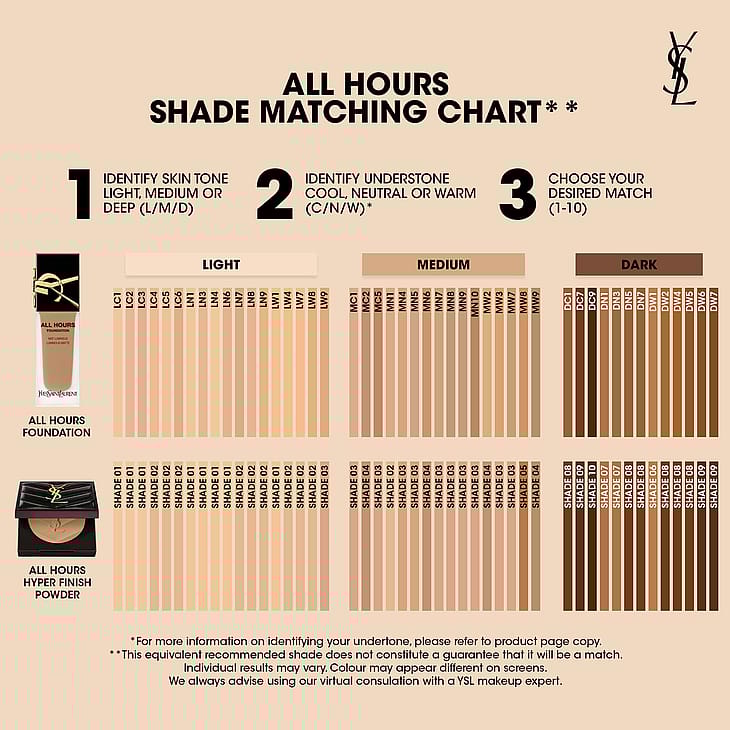 Saatavana jopa 11 sävyä.. All Hours Hyper Powder täydentää All Hours -tuotesarjaa, joka sisältää All Hours Hyper Bronze -aurinkopuuterin, All Hours Foundation -meikkivoiteen ja All Hours Precise Angles Concealer -peitevoiteen. Tämä sävy vastaa entisen All Hours Setting Powder -puuterin sävyä B20.