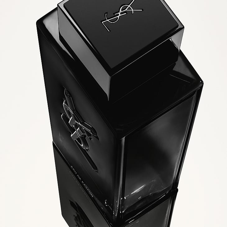 YSL-siluetti pullossa. Hohtava. Soljuva. Mustaksi maalattu monoliitti, josta voit nähdä itsesi. Lasiin upotettu sydän on ikoninen YSL Cassandre -logo.