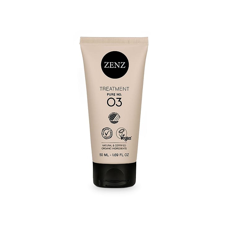 Treatment Pure no. 03 on mieto ja tehokas hiusnaamio, joka kosteuttaa, vahvistaa ja hoitaa kaikkia hiustyyppejä. Sopii erityisesti hauraille, kuiville ja vahingoittuneille hiuksille sekä herkälle hiuspohjalle. Vahvistaa hiuspohjaa ja hiustuppia ja tekee hiuksista hyvinvoivat, kiiltävät ja silkinpehmeät. Hajusteeton naamio antaa hiuksille ja hiuspohjalle proteiineja, vitamiineja ja mineraaleja sekä paljon kosteutta ja hoitoa. Naamio tunkeutuu syvälle hiuksen sisäkerrokseen, jossa se pehmentää ja korjaa hiusta sisältäpäin. Näin hiuksen kunto paranee ja hius vahvistuu ja saa suojaa. Se kietoutuu hiuksen ympärille tehokasta vaikutusta varten, ja sitä voi käyttää myös hiuspohjaan, koska se ei sisällä silikonia. Lisäksi se pidentää värin kestoa. Anna vaikuttaa hiuksissa vähintään 10 minuuttia, mielellään 30 minuuttia, pyyhkeen tai ZENZ Organic HairSpa -hatun alla. Jos hiukset ovat hyvin vaurioituneet, käytä 1?2 kertaa viikossa vahvistamaan hiuksia ja parantamaan hiuslaatua. Jos hiuksissa on vain vähän vaurioita, käytä 1?2 kertaa kuussa vahvistamaan hiuksia ja ehkäisemään haaroittumista.